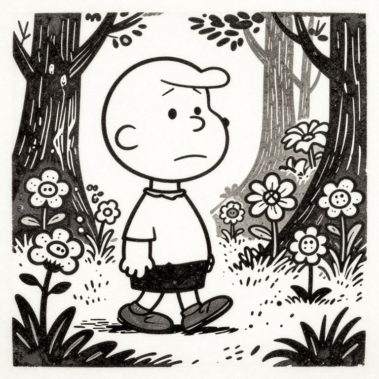 Charles Schulz linocut of a sad, young female zombie making her way through a forest of mutant flowers,