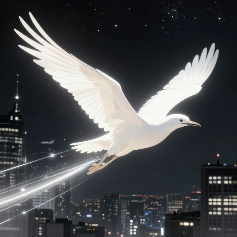 Glittering white dove in flight with illuminated wings and trailing light trails, soaring above a dark, starry cityscape of lit skyscrapers.