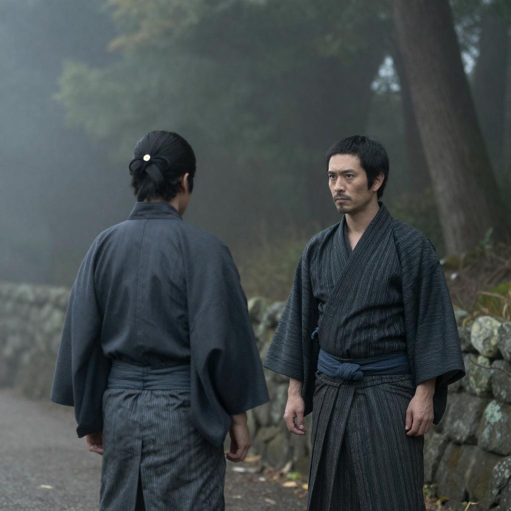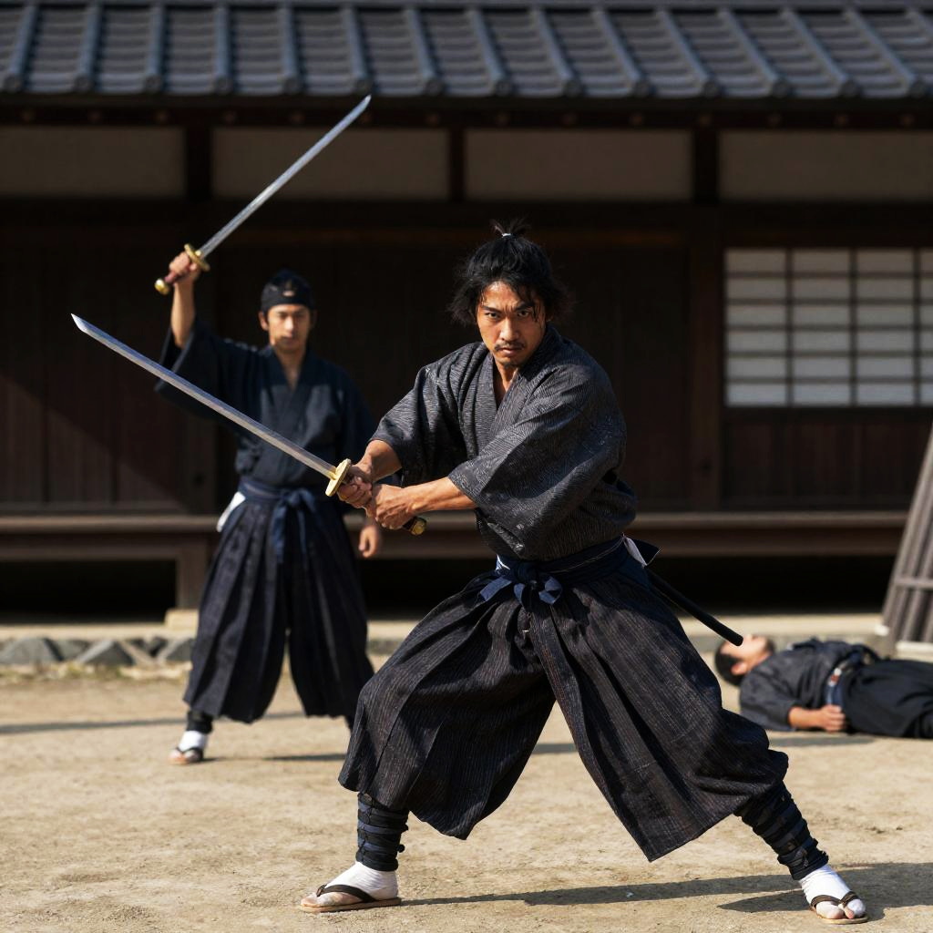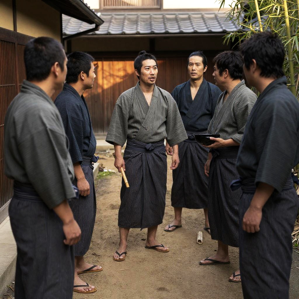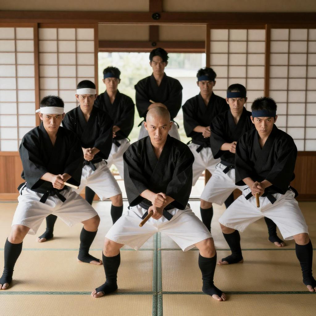 Group of Japanese martial artists in traditional attire, white headbands, dark and blue patterned shirts, white pants, and belts. Center figure stands with a determined expression, fists raised. Others stand with serious expressions, holding wooden sticks. One man in brown robe faces them from the left. Wooden background, traditional Japanese architecture. Six men visible.