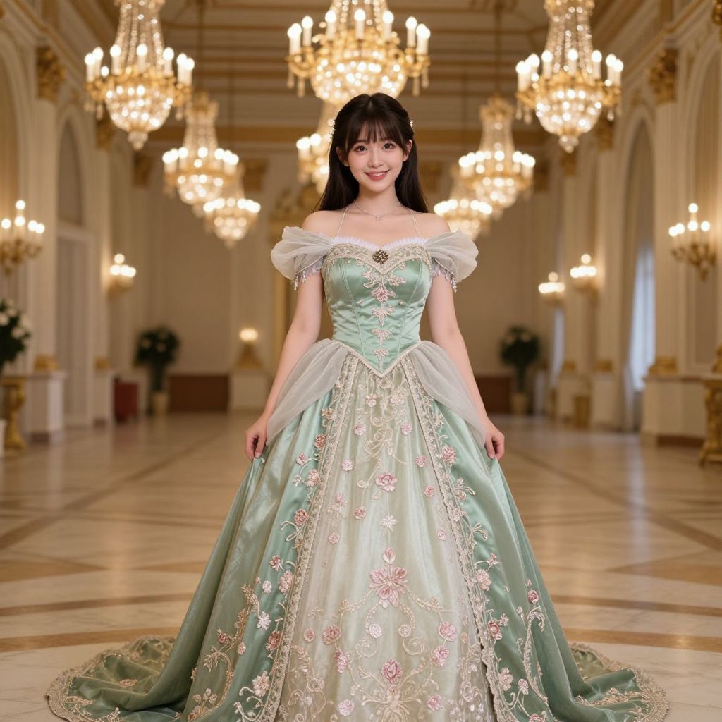 Photograph of an East Asian woman with fair skin and long black hair, standing in an opulent, grand ballroom adorned with multiple chandeliers. She wears a mint green, off-the-shoulder ball gown with white floral embroidery and a full, flowing skirt. The gown features delicate lace and intricate beadwork. She smiles warmly, with her hands resting at her sides. The ballroom has ornate, cream-colored walls, tall arched windows, and a polished marble floor. The lighting from the chandeliers casts a warm, inviting glow throughout the room.