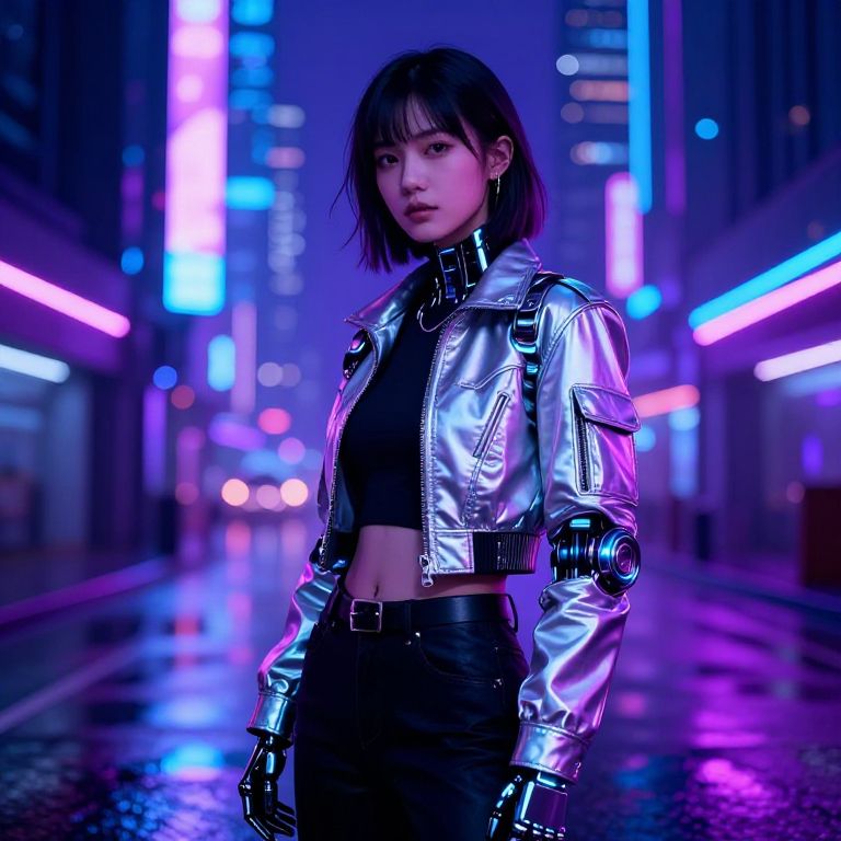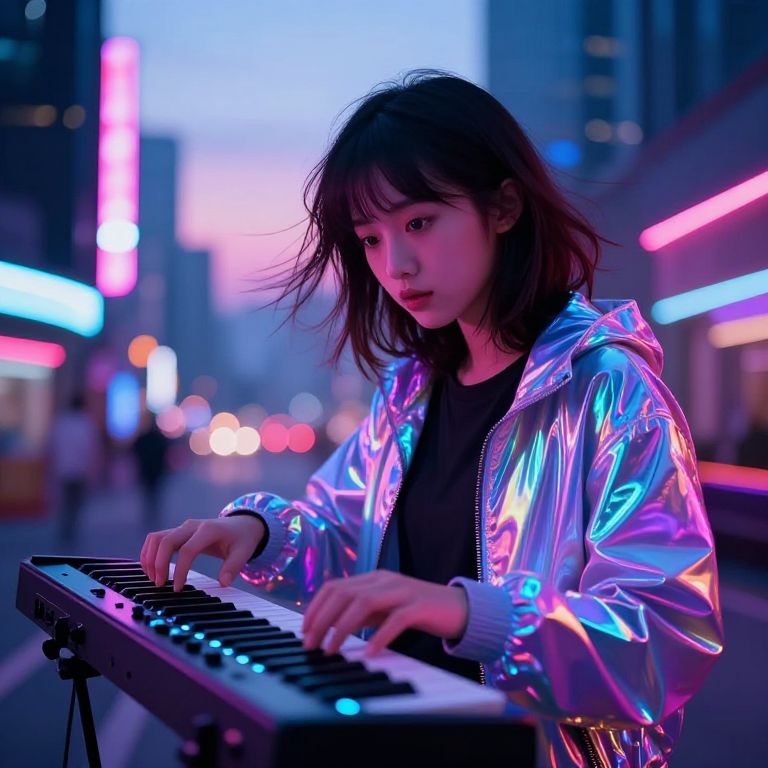AI tween girl wearing a holographic jacket playing a digital musical instrument in a neon-lit city at dusk, dynamic lighting, expressive eyes, immersive tech environment, vibrant futuristic scene, cinematic composition, Flux style