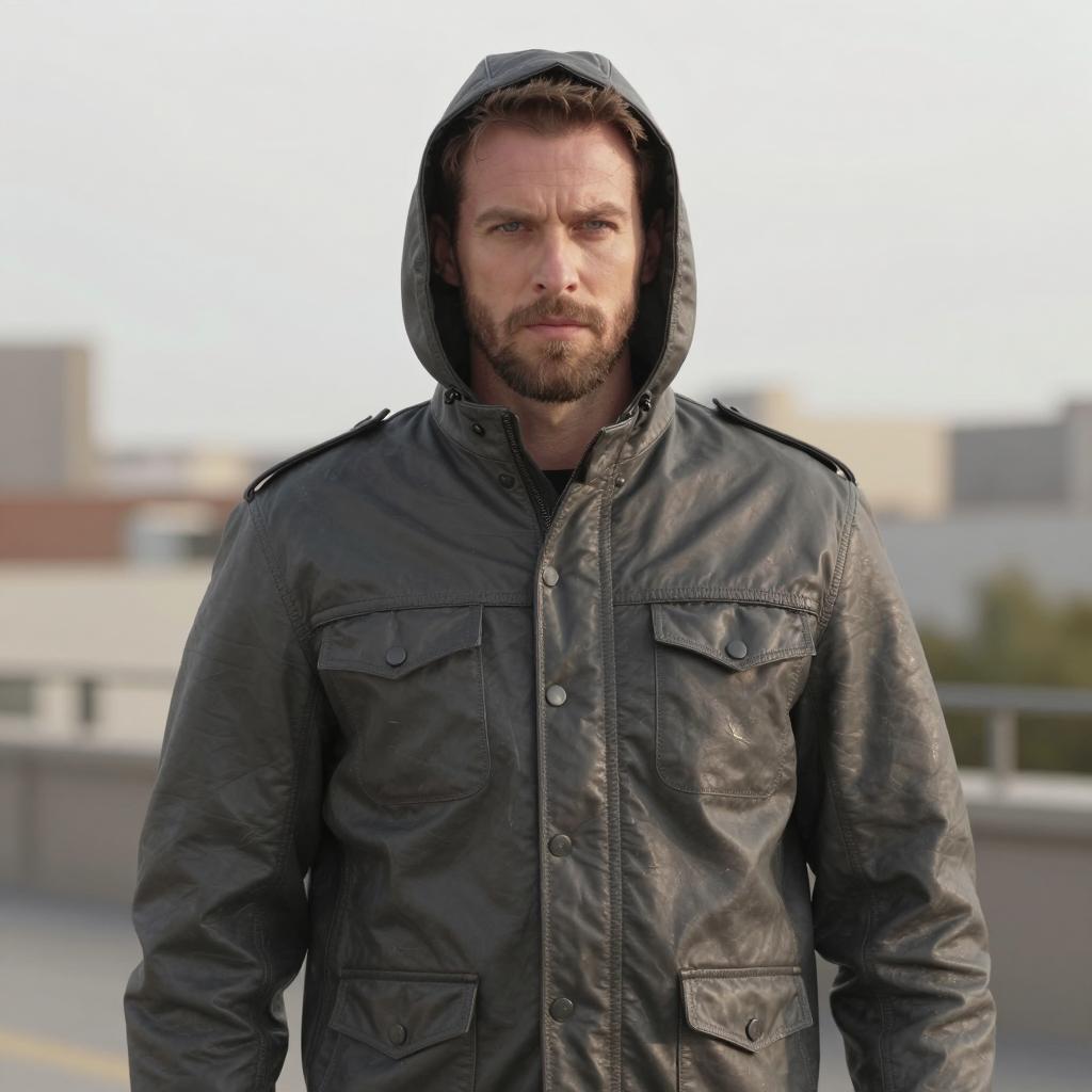 Man in Hooded Leather Jacket Outdoors