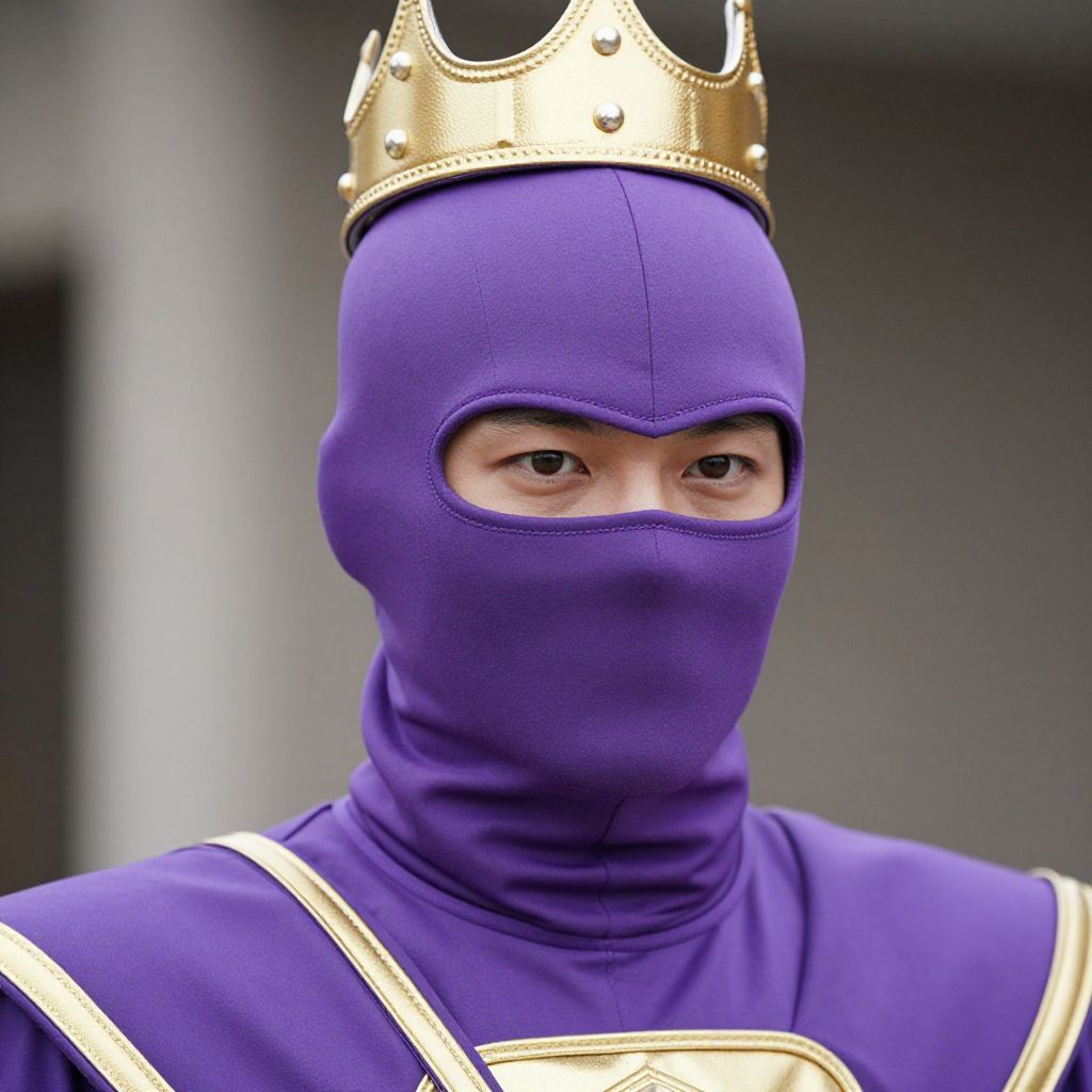 Photograph of a person with light skin, wearing a tight, purple, full-face mask with only the eyes exposed, and a gold crown on top. The mask and crown are made of fabric and metal, respectively. The person is also dressed in a purple outfit with gold trim, resembling a royal or court jester costume. The background is blurred, with indistinct gray and white tones, suggesting an indoor setting. The person's eyes are focused and slightly narrowed, giving an intense expression. The costume and mask are smooth and tightly fitted, highlighting the person's facial features through the eye openings.