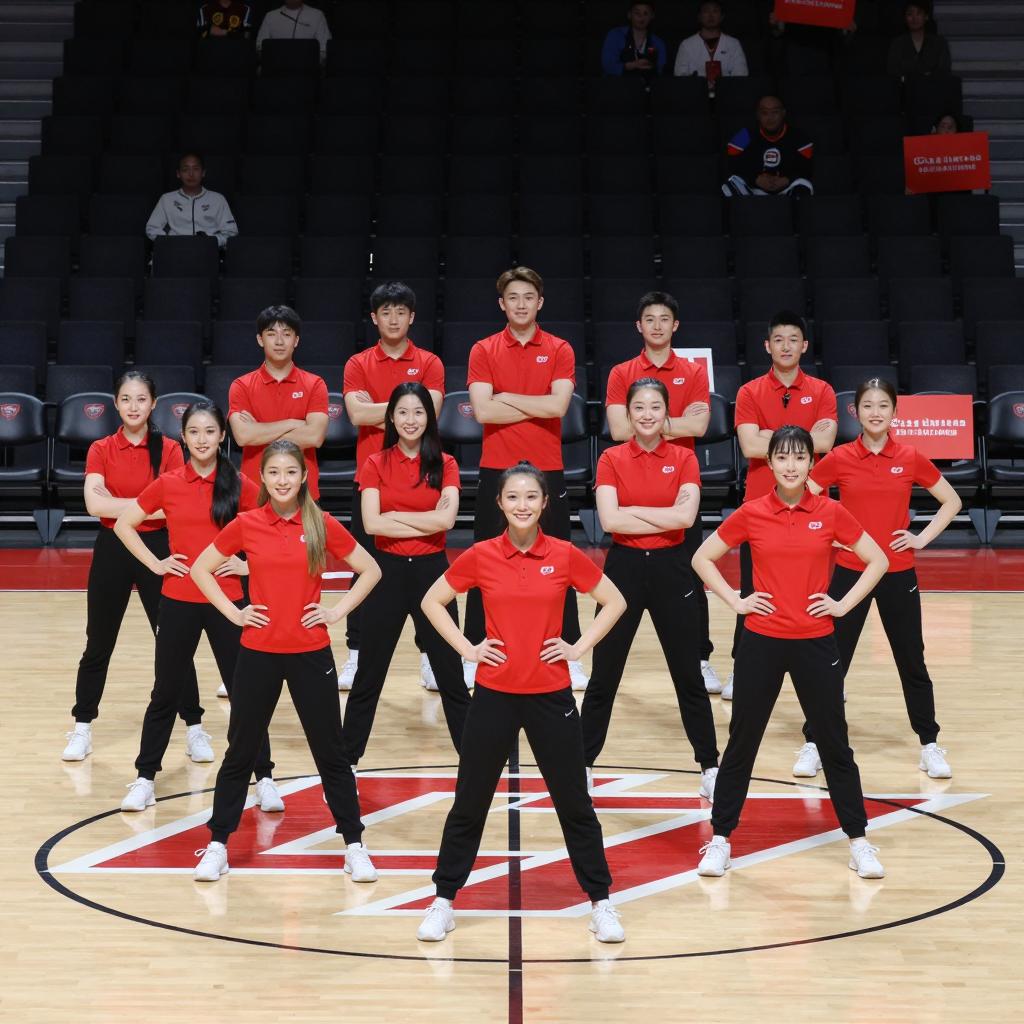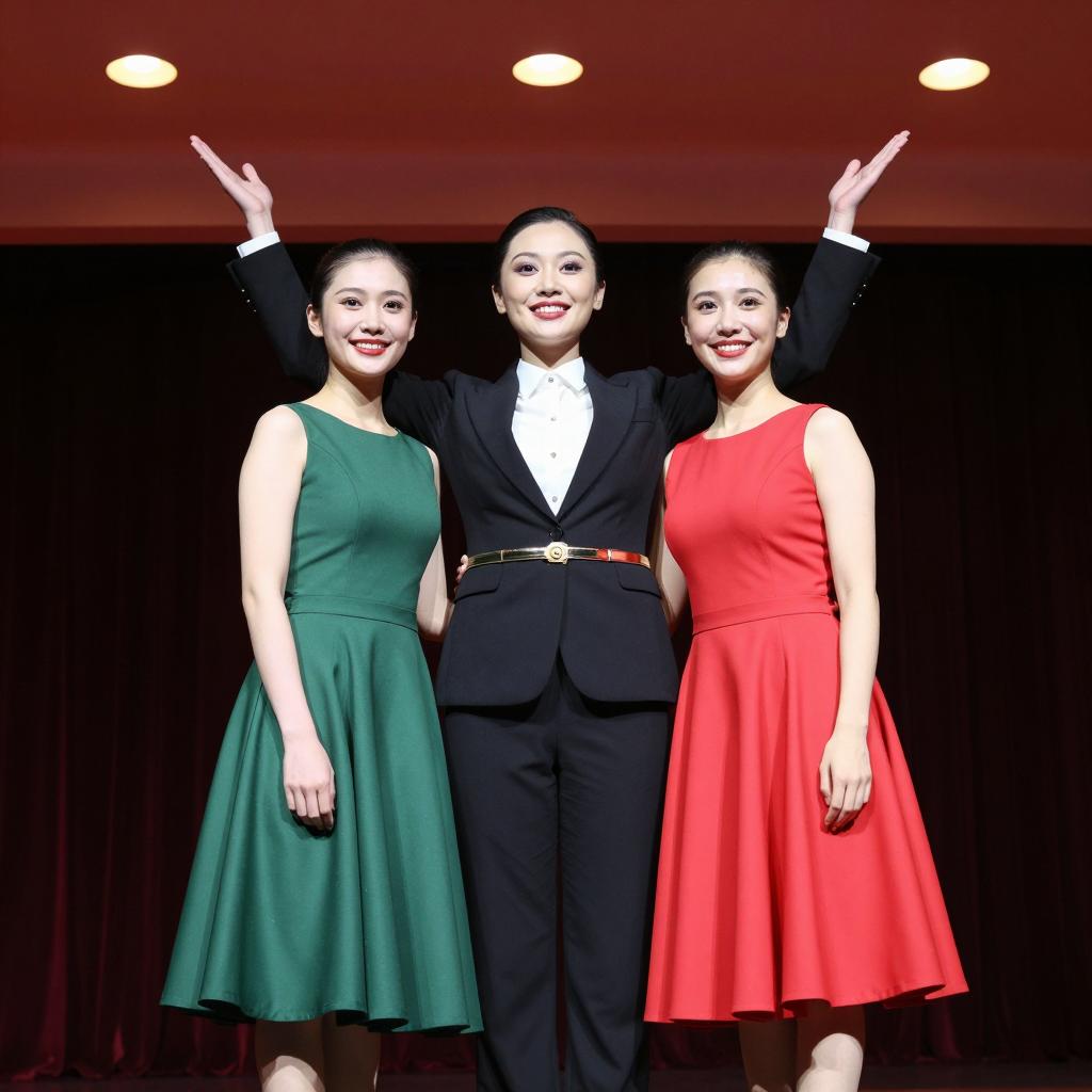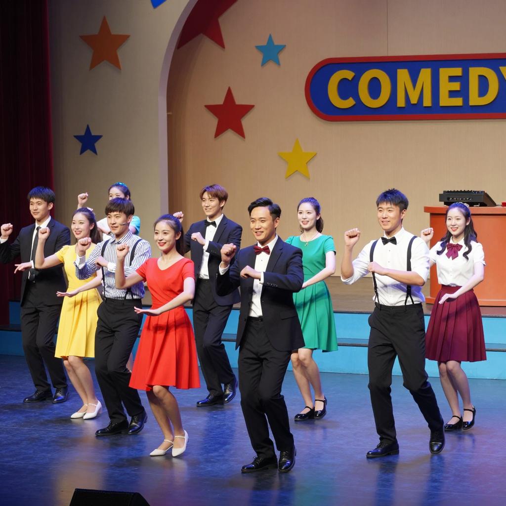 Group of 15 people dancing on stage. Men in suits, some in shirtsleeves, women in dresses and skirts. Bright colors, star decorations on walls. "COMEDY SHOW" sign in background. People in mid-dance moves, smiling. Blue stage floor. Background includes a podium and a mixer. Vibrant, lively setting.