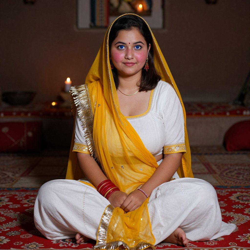 Photograph of a young South Asian woman with medium skin tone and black hair, sitting cross-legged on a red patterned carpet. She wears a white kurta with gold trim, a yellow saree with gold fringes, and red bangles on both wrists. Her makeup includes pink blush and blue eyeshadow. She has a calm, gentle expression and a bindi on her forehead. In the dimly lit background, there are lit candles and a blurred painting on the wall. The overall ambiance is warm and traditional.