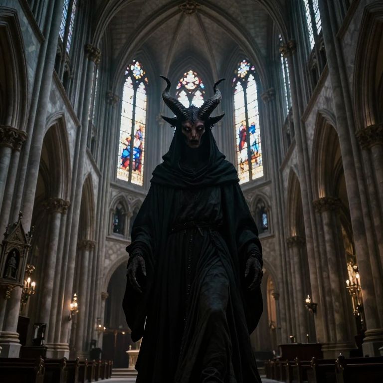 In the heart of a grand cathedral, a creature with glowing eyes and long, curved horns emerges from the shadows, casting an eerie presence. The cathedral's arched windows allow a soft, ethereal light to filter through, illuminating the scene with a mystical glow. The creature, cloaked in a dark, flowing robe, stands in the center of the nave, its form almost blending with the shadows. The walls, adorned with intricate carvings and stained glass, add to the gothic atmosphere, while the columns and vaulted ceilings rise majestically around it. A sense of demonic energy permeates the space, enhanced by the creature's menacing visage and the dim, flickering light that dances across its features. The overall composition is one of tension and mystery, with the creature and cathedral elements interacting in a harmonious yet unsettling way, creating a scene that is both visually striking and emotionally charged.