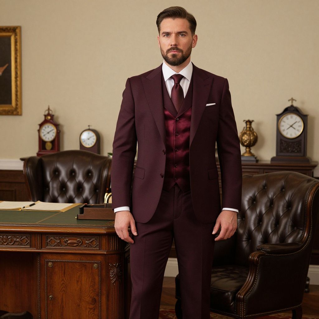 An executive in a formal costume made of deep burgundy tailored clothing, complete with a silk waistcoat and tailored pants, stands in a vintage-style office lounge with a vintage desk, leather chairs, and antique clocks in the background—a man with a serious face and a well-groomed beard watches from a nearby chair, creating a scene of timeless business elegance.