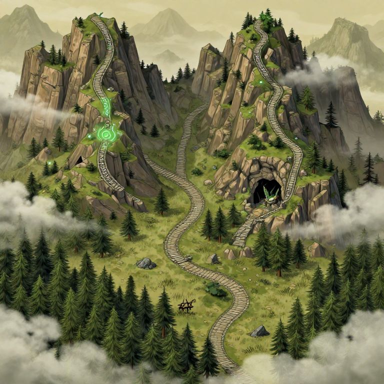 Dnd map mountains with ancient stone paths winding through jagged peaks, dense pine forests at their base, mystical glowing runes along the ridges, a hidden dragon's cave entrance, atmospheric mist rolling over the craggy terrain, fantasy RPG style illustration.
