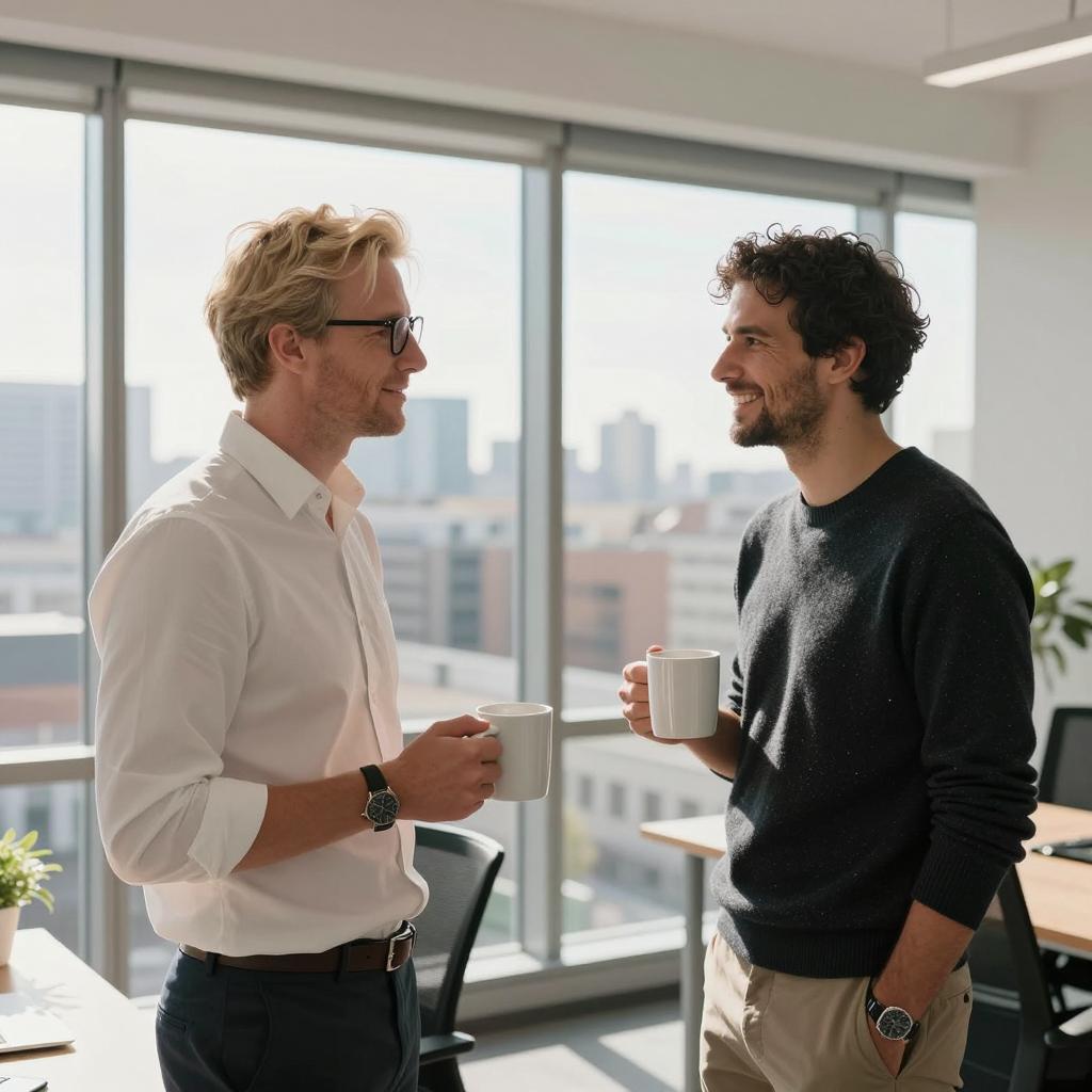 Two men standing and holding white mugs, engaged in a friendly conversation in a sunlit modern office with large windows showing a cityscape. One man has blonde hair, wears glasses, a white shirt, dark pants, and a watch. The other man has dark curly hair, a dark sweater, beige pants, and a watch. The office is bright and contemporary with visible desks and chairs.