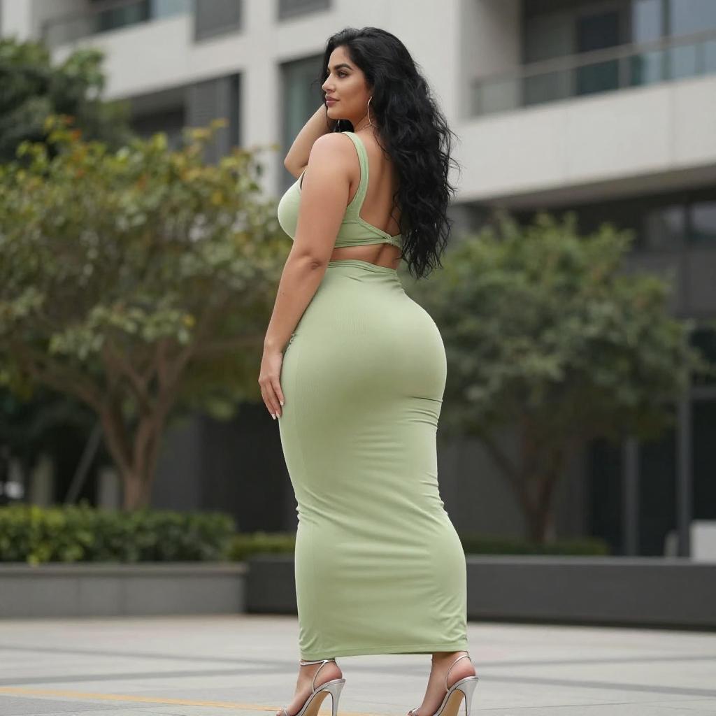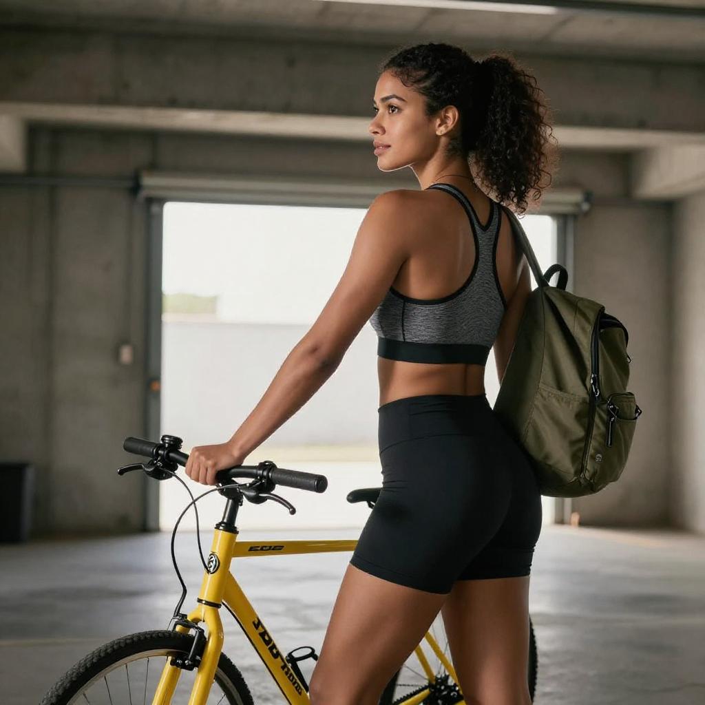 Photograph of a smiling woman with long dark hair in a green cycling outfit and helmet, standing beside a green bicycle on a sunny, tree-lined path. She has a curvy physique with prominent buttocks, looking over her shoulder. The background includes lush greenery and a clear blue sky.