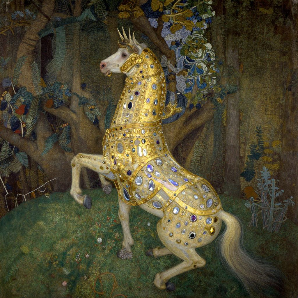 Digital artwork of a golden, jeweled horse with antlers, standing on lush green grass, surrounded by dark, intricate forest background.