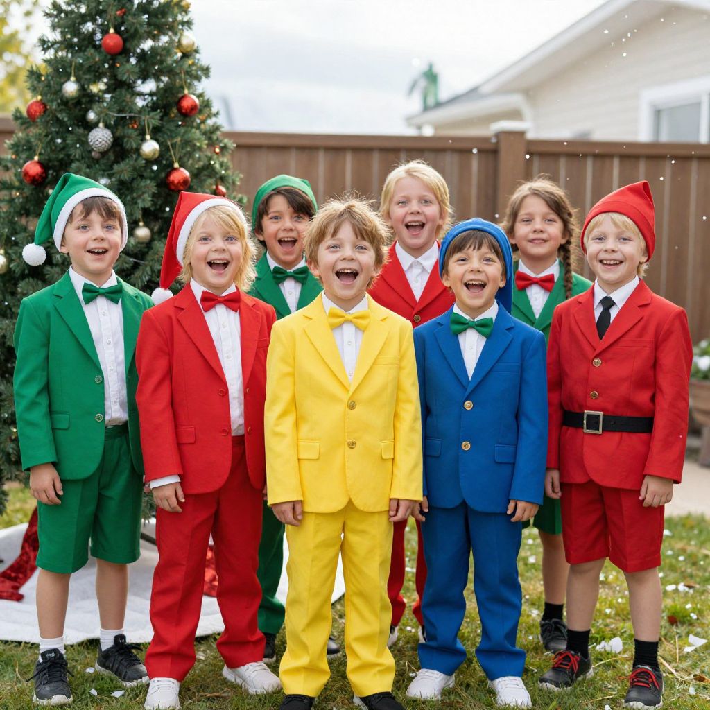A group of happy children dressed in a vibrant children's suit and costume, smiling brightly with big eyes and playful expressions, standing in a sunny backyard during a festive holiday celebration with a Christmas tree in the background and snowfall in the distance.