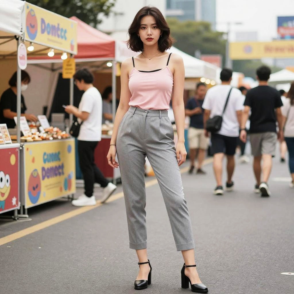 A busty woman in a digital manga style, casually chic in a light pink tank top with thin straps, a black bandeau underneath, and cropped heather grey trousers. She wears ankle strap black leather heels with chunky heels and minimal jewelry, her short dark wavy hair framing her face. She stands at a vibrant street festival, surrounded by colorful stalls and lively crowds. Sexy. Pretty face and beutiful eyes
