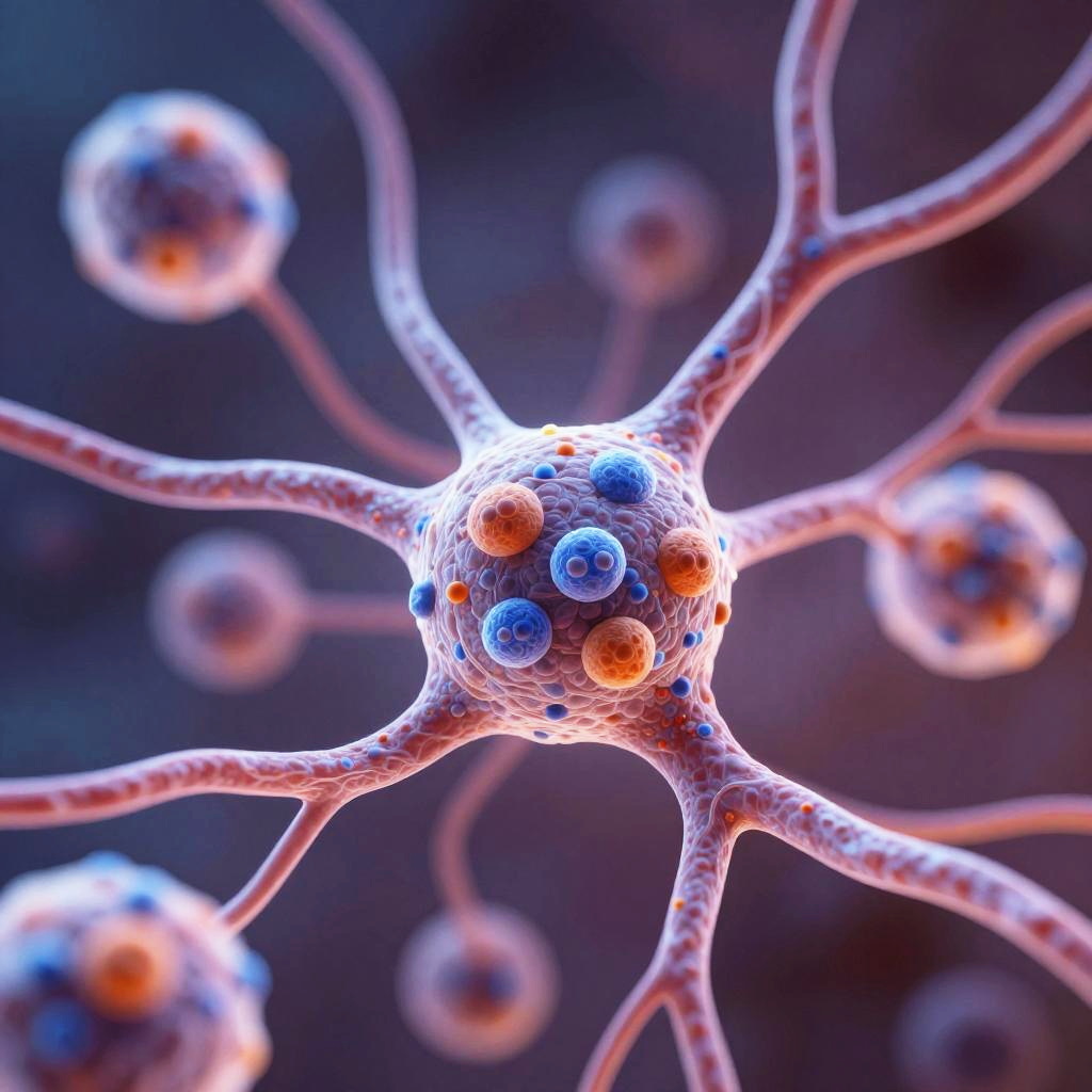 Artistic representation of vesicles bursting and releasing neurotransmitters in a synaptic cleft, vibrant colors, glowing particles, and fluid motion, detailed visualization of brain cell communication, digital painting style with high contrast lighting and sharp details.