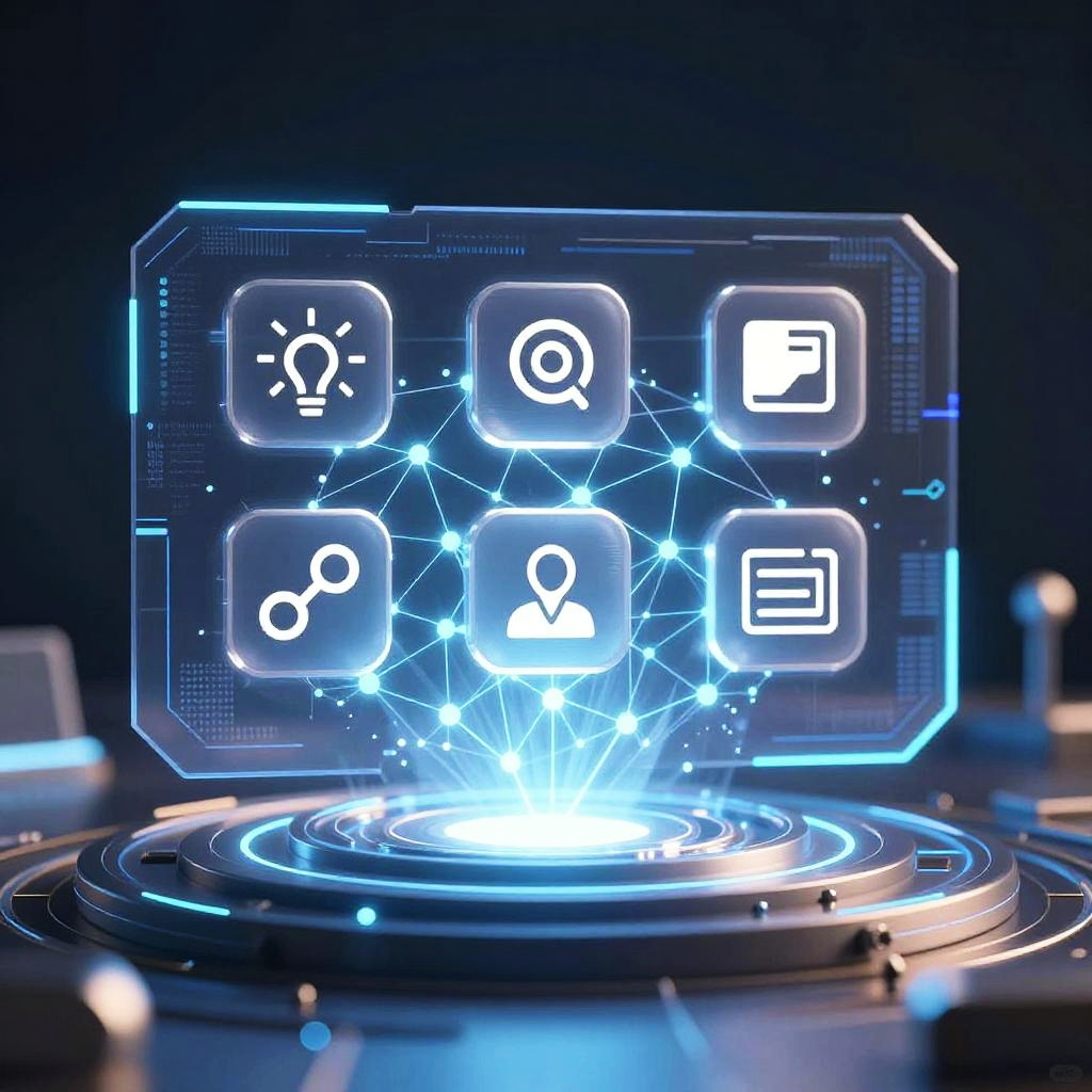 AI icon generator concept, futuristic digital interface with glowing neural network patterns, sleek minimalist icons emerging from a high-tech holographic screen, vibrant blue and silver color palette, modern UI design, ultra detailed, cinematic lighting