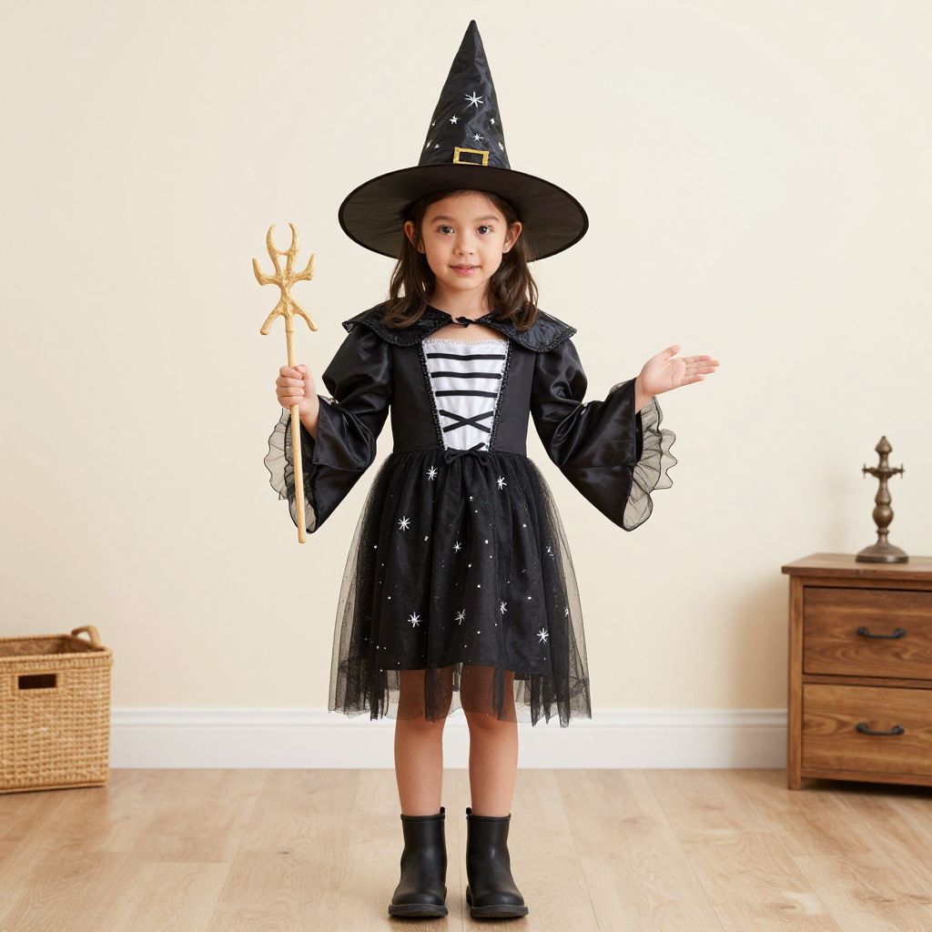 Photograph of a young girl in a black witch costume with star-patterned dress, wide-brimmed hat, holding a trident, standing on