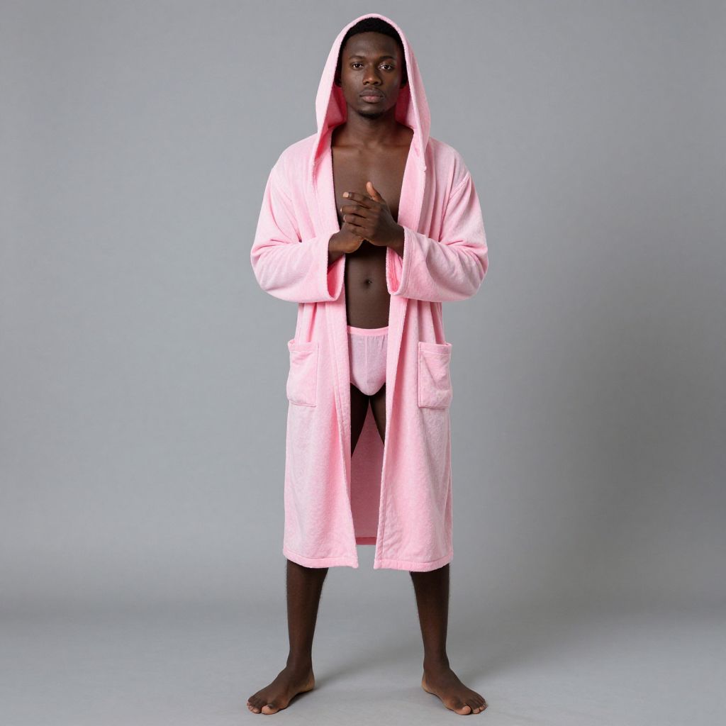 Photograph of a tall, muscular Black man with dark skin and short hair, standing against a plain light gray background. He wears a light pink, hooded bathrobe that is open, revealing a bare chest, and light pink underwear. His hands are clasped in front of his chest, and he stands barefoot with his feet slightly apart. The robe's fabric appears soft and slightly textured. His expression is neutral, and he gazes directly at the camera. The overall composition is simple, focusing on the subject without any additional objects or distractions.