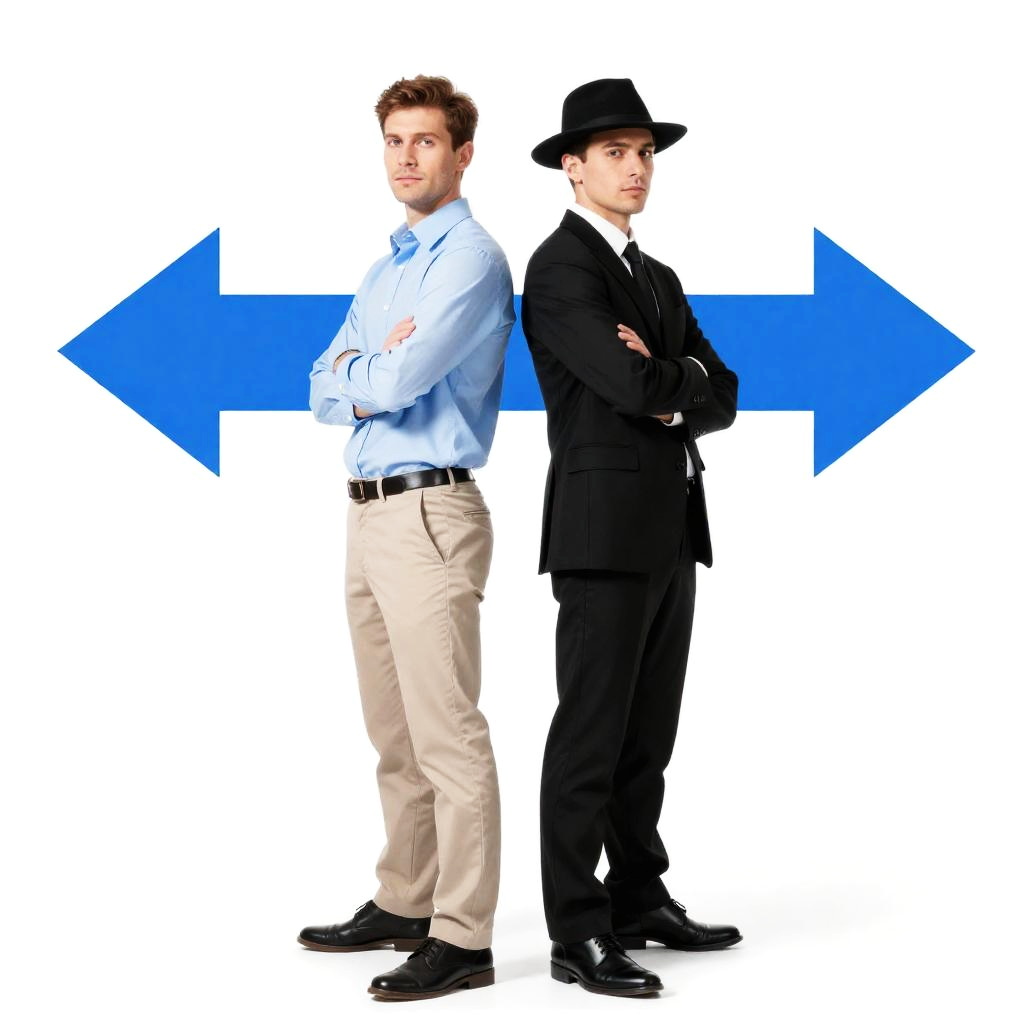 Photograph of two blurred male figures in business attire running. The left figure wears a white captain's hat, black suit, and white shirt. The right figure wears a brown fedora, blue blazer, and white shirt. Large blue arrows point diagonally from left to right behind them. Both figures have indistinct facial expressions.