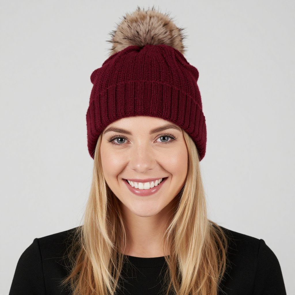 Photograph of a young woman with light skin and long blonde hair, smiling at the camera. She wears a maroon knit beanie with a large, fluffy beige pom-pom on top, and a black long-sleeved shirt. The background is a plain, light gray. Her eyebrows are well-groomed, and she has light makeup, emphasizing her natural beauty. The image is brightly lit, highlighting her cheerful expression and the texture of the knit hat. She is centered in the frame, looking directly at the camera.