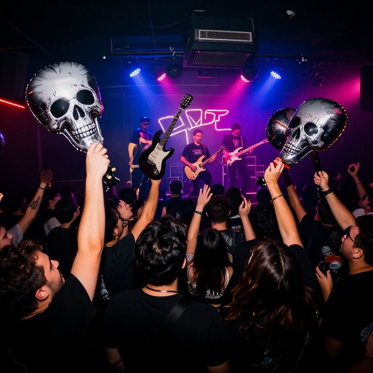 Heavy metal happy birthday party with a roaring crowd holding up metallic balloons shaped like skulls and guitars; a stage with a band playing intense riffs, neon lights flashing in dark smoky club environment, vibrant and edgy celebration vibe