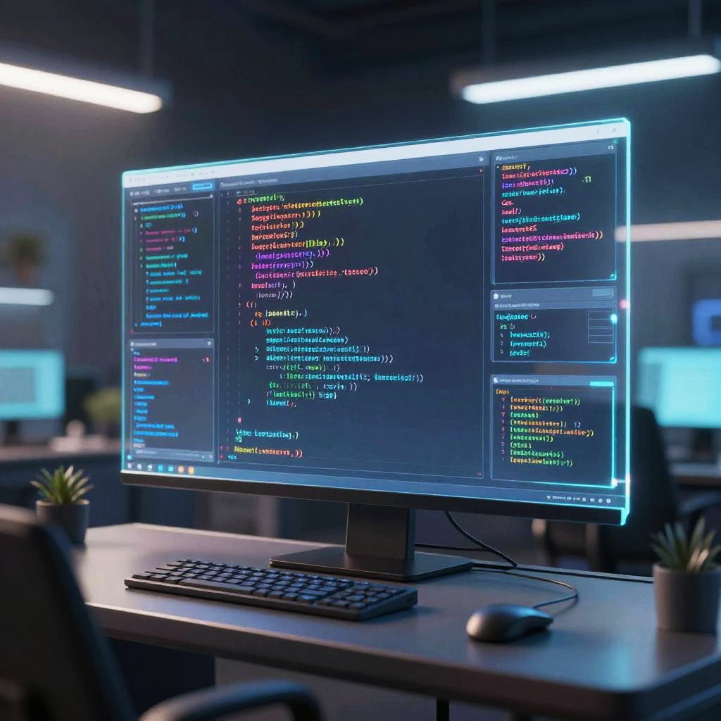 Sdxl prompting illustration, a sleek computer terminal with floating transparent screens, AI code being written in mid-air, futuristic workspace bathed in cool lighting, cyberpunk aesthetic, high resolution, emphasis on glowing elements and digital text