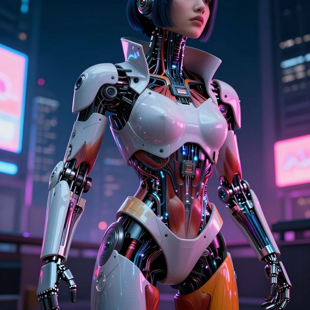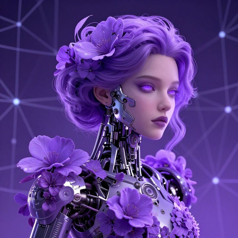 Digital artwork of a cybernetic woman with purple hair, mechanical neck, and flower-adorned shoulders, illuminated against a purple geometric background.