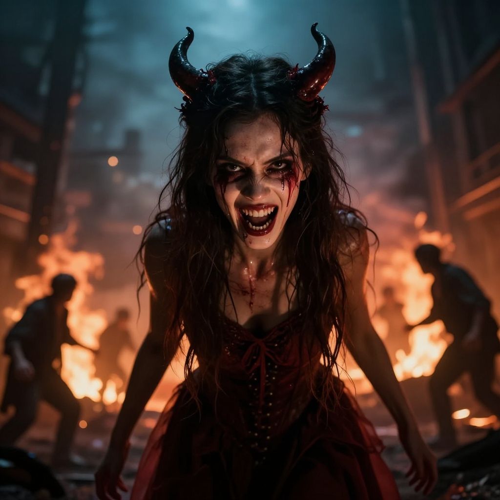 Photograph of a demonic woman with black horns, bloody face, and tattered dress, crouching amid fiery chaos, silhouetted figures