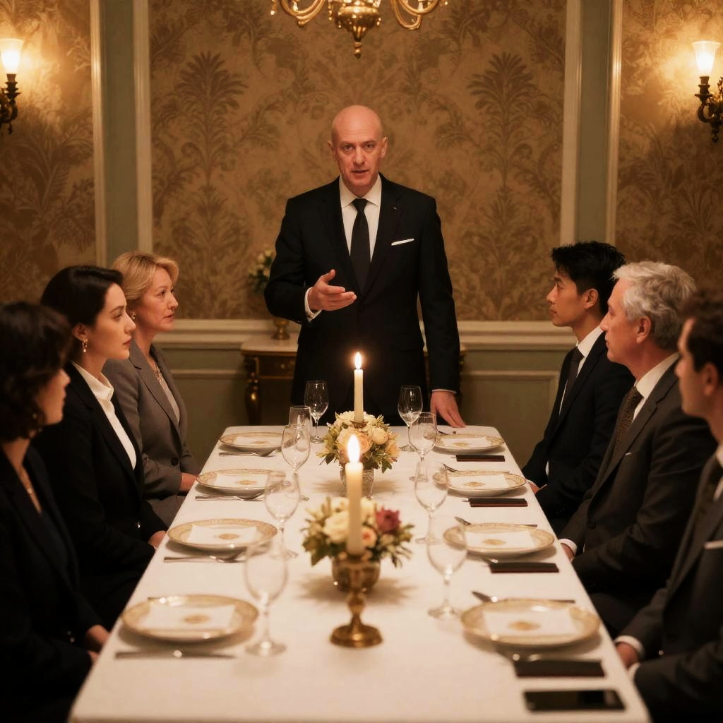 Photograph of a formal dinner with nine people, seated around a table. A bald man in a suit stands at the head, speaking. Candlelit table with plates, glasses, and cutlery. Warm, ornate wallpaper background. Intense expressions from seated individuals.