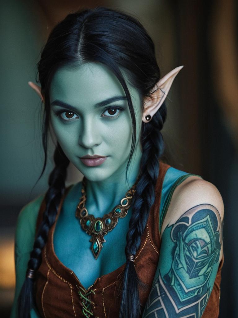 Portrait of a realistic fantasy elf woman featuring blue-green skin, pointed ears, long black braided hair, and brown eyes. She wears a brown sleeveless garment and an ornate necklace with green gemstones. A detailed tattoo decorates her upper arm. The image is set against a softly blurred background, emphasizing her intense gaze and fantasy character traits.
