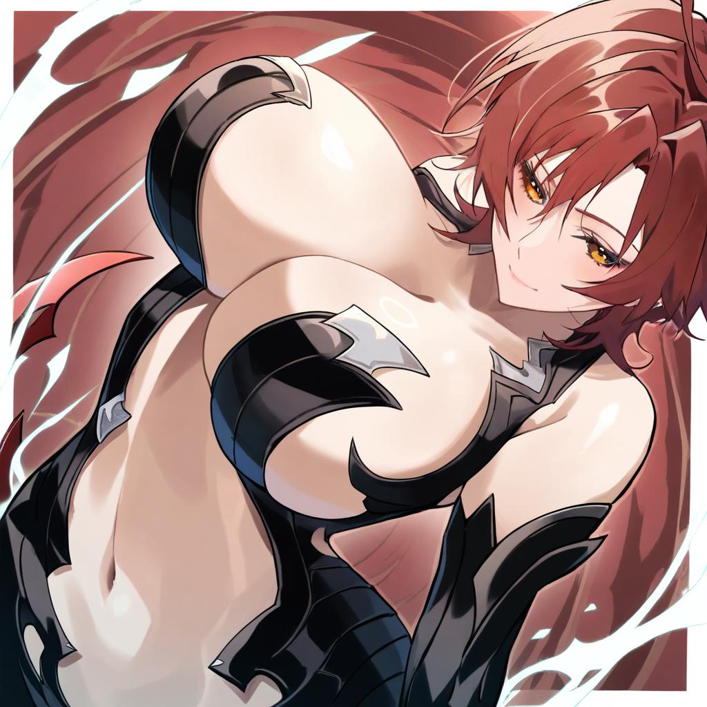 Amaha masane, witchblade, 1girl, mature female, brown eyes, brown hair, red hair, short hair, large breasts, huge breasts, cleavage, navel, black sclera, by artist u yuz xx, animagine