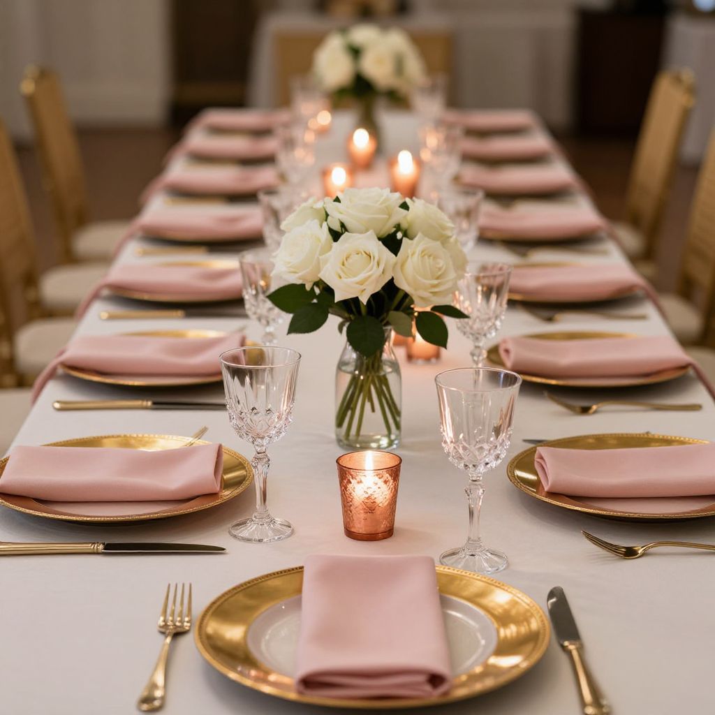 Elegant Eastnor Castle dining room showcases a meticulously set long table adorned with white linens, floral centerpieces, and crystal glassware, flanked by wooden chairs beneath ornate chandeliers and framed portraits of distinguished figures.