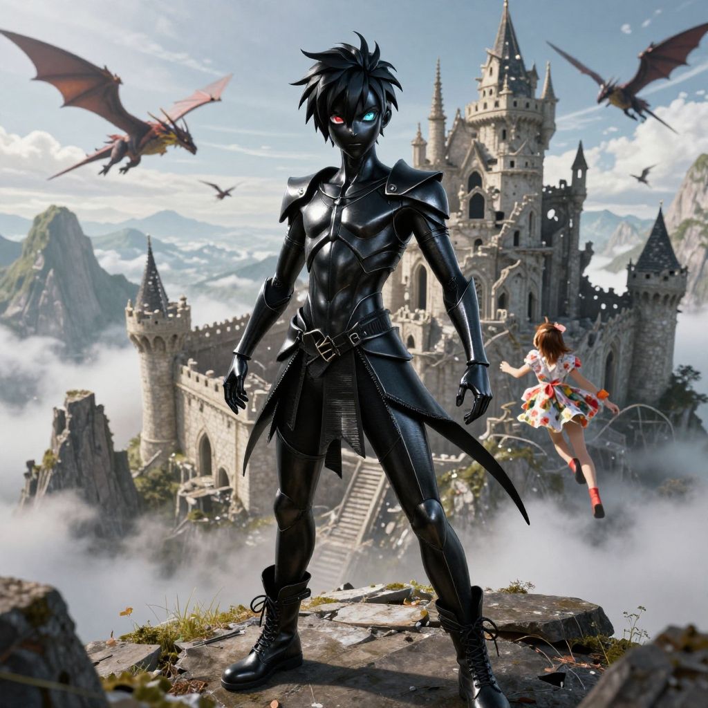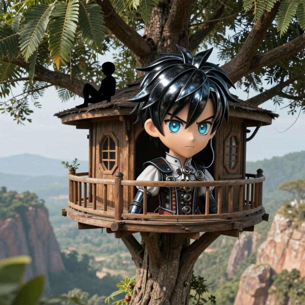 (Breezy Tropical Treehouse:1.3), (A energetic boy forged from black metal:1.2), (his silhouette sleek and formidable, with a surface that catches the light with a subtle, enchanting luster), (features finely wrought, suggesting both strength and elegance, his presence commanding yet ethereally graceful) (with expressive Complete Heterochromia eyes, wires showing, wearing Steampunk corset and Victorian blouse:1.2), (Proximity Wingsuit Flying Over Rugged Terrain (navigating close to mountains or cliffs):1.3), UHD, 4k, anime, highly detailed face, cinematic, hyper realistic