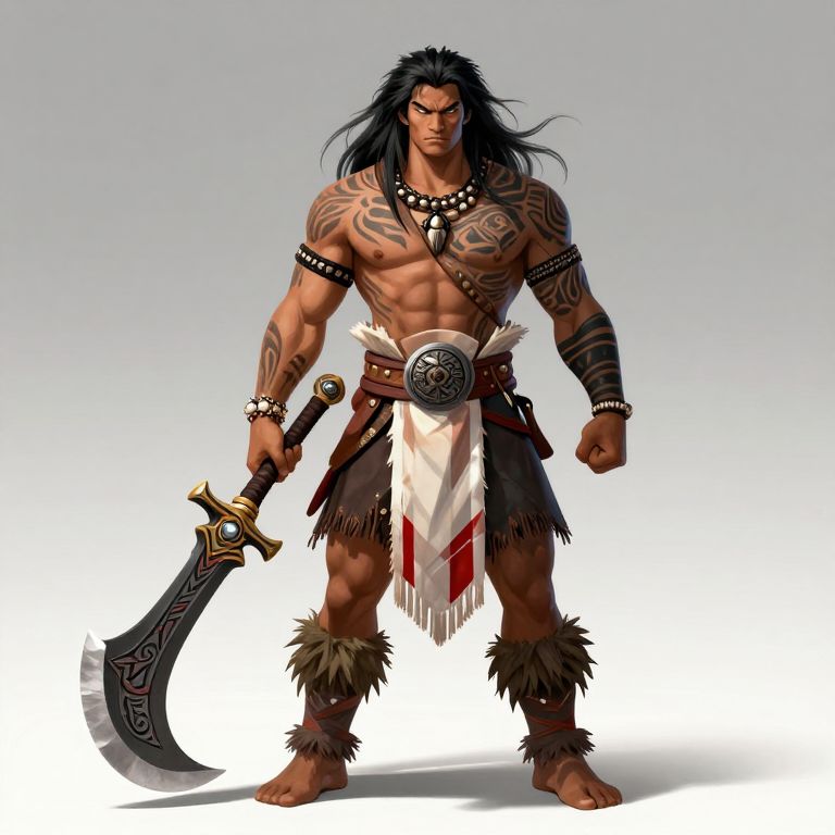 The image depicts a dark fantasy character design, featuring an imposing Polynesian warrior. The warrior stands full body, exuding a sense of strength and readiness. His long black hair flows freely, adding to his imposing presence. He is adorned with intricate tribal tattoos that cover his arms and torso, enhancing his fierce appearance. The warrior's attire is a mix of traditional and battle-ready elements, including a white loincloth with red stripes, a leather belt, and various arm bands and bracelets. His left hand grips a large, ornate weapon, which appears to be a mesoamerican-style blade, with a sharp, curved blade and a decorative hilt. The weapon's design is detailed and imposing, matching the warrior's overall aesthetic. The background is minimal, allowing the warrior to be the focal point of the image. The overall composition is balanced, with the warrior centrally positioned and the weapon held in a ready stance, creating a dynamic and powerful visual.