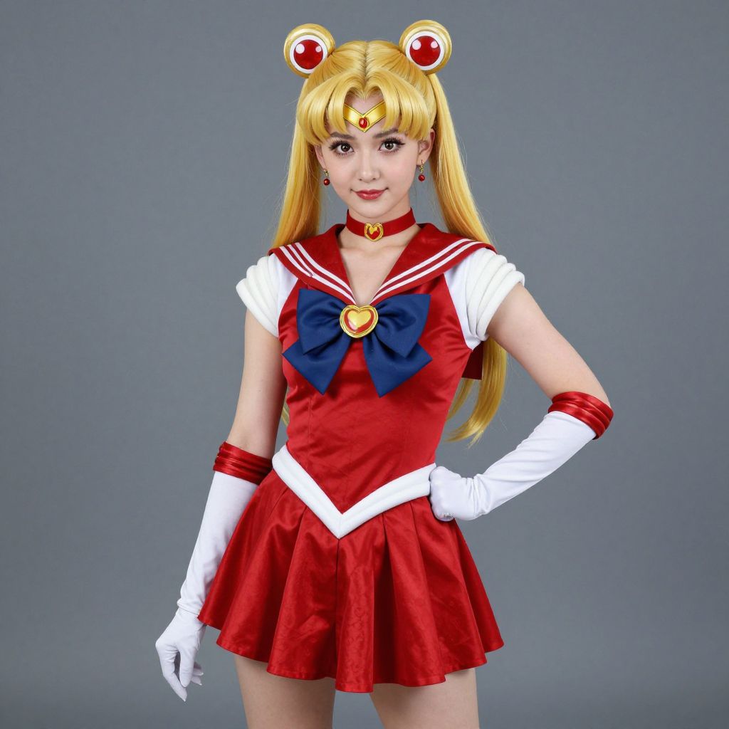 Photograph of a young woman cosplaying as Sailor Moon, standing against a plain gray background. She has long, straight blonde hair with red and white hair buns, and wears a red and white sailor-style outfit with a large blue bow at the chest, white gloves, and a red skirt with white trim. Her red choker has a gold heart pendant, and she has a red and white tiara on her forehead. Her expression is neutral, and she stands with one hand on her hip. The costume is detailed, with shiny, satin-like textures, and she looks directly at the camera.