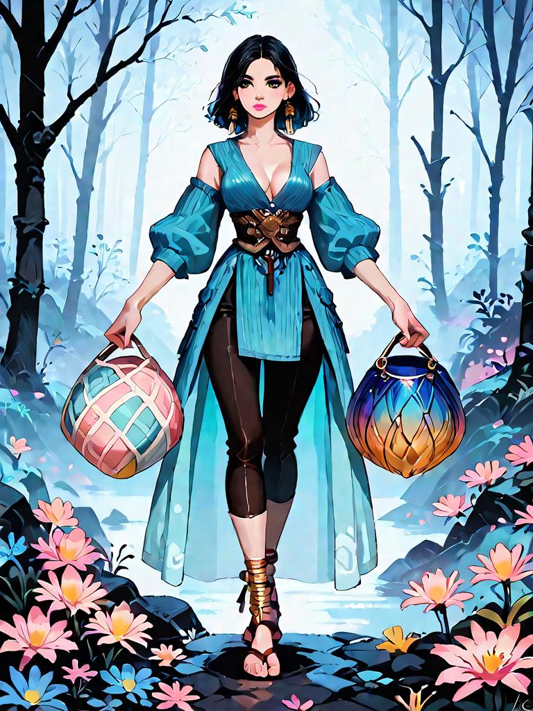 Digital illustration of a full-body woman with short black hair wearing a blue ribbed monokini with a plunging neckline and gladiator sandals. She holds a large woven beach bag with metallic gold accents, standing amidst vibrant pastel coral and exotic flowers with a fantasy night mist and foggy landscape background. The scene evokes a dark fantasy and bohemian vibe with bright colors and detailed textures.