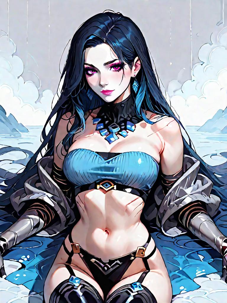 Fantasy Woman in Blue Monokini at Vibrant Coral Nightscape