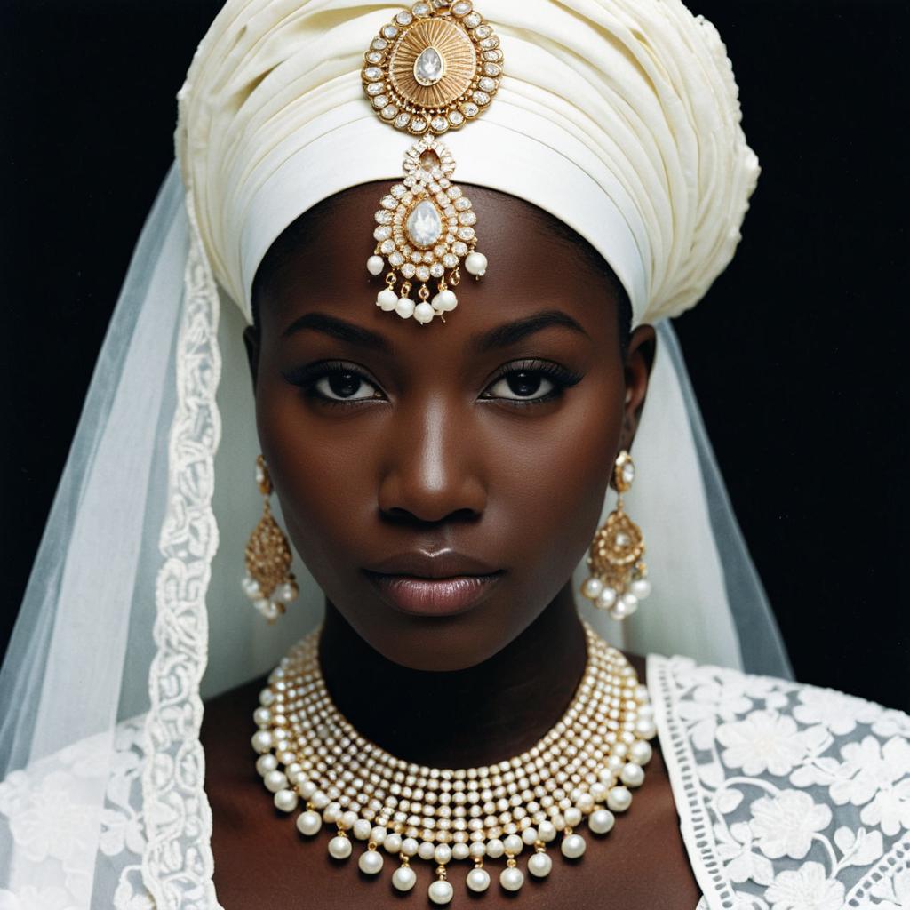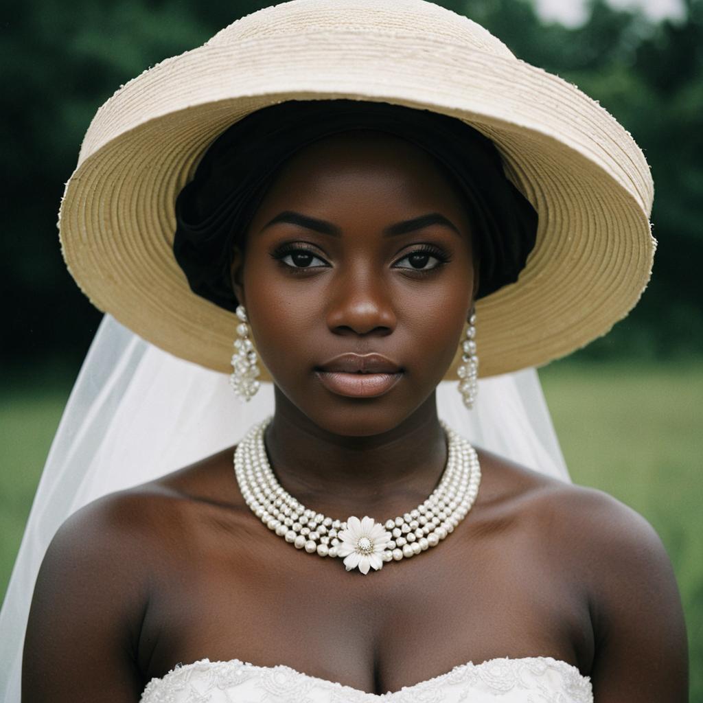 African american vintage,1girl, jewelry, solo, necklace, earrings, realistic, hair ornament, hand on own neck, hair flower, brown hair, looking at viewer, shirt, upper body, lips, dark skin, brown background, flower, short sleeves, photorealistic, dark-skinned female, nose