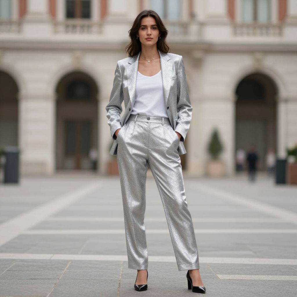 Photograph of a confident woman standing in an urban courtyard. She has wavy dark brown hair and is wearing a shiny silver blazer and high-waisted silver pants with a white V-neck blouse. Her hands are in her pants' pockets, and she wears black high-heeled shoes. The background features a blurred, ornate building with arched windows and a gray stone pavement. The overall style is modern and chic, with a metallic, reflective texture contrasting with the white blouse. The woman's expression is neutral, and the lighting is natural, highlighting the metallic fabric.