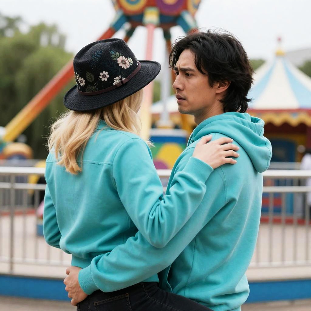 Photograph of a man with medium-length dark hair, wearing a turquoise hoodie, holding a woman with blonde hair and a black floral hat, from behind. She wears a turquoise jacket. Background: amusement park with colorful rides, blurry trees. Man's expression: concerned. Woman's expression: obscured. Man's hand on woman's shoulder. Bright daylight.