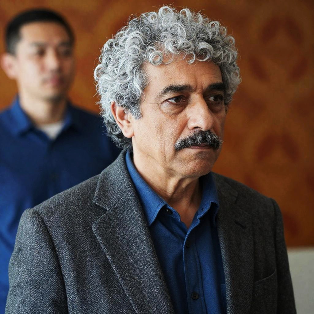 Photograph of a middle-aged man with curly gray hair and a mustache, wearing a gray herringbone jacket over a blue shirt, looking to the side with a neutral expression. Background includes a blurred man in a blue shirt and an orange, patterned wall.