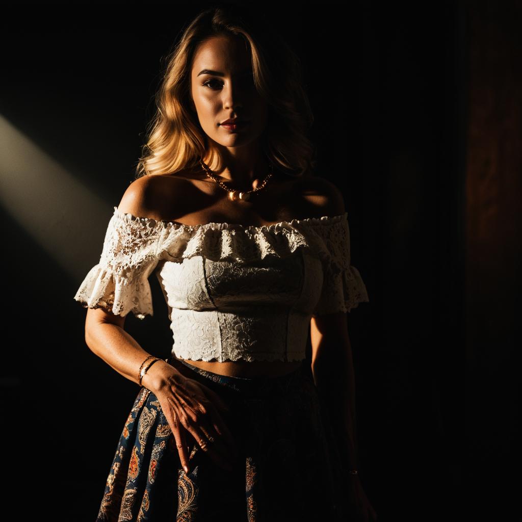 Photorealistic portrait of an elegant woman wearing an ivory off-shoulder cropped lace top with ruffle details, paired with a fitted paisley patterned skirt. The subject is accessorized with layered necklaces and thin bangle bracelets, illuminated by soft cinematic lighting against a dark background, creating a dramatic and stylish atmosphere.