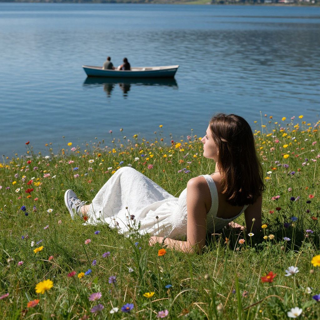 Woman lounging gracefully in a vibrant meadow of colorful wildflowers, her gaze directed toward a serene lake where a small boat floats gently, its occupants silhouetted against the tranquil waters.