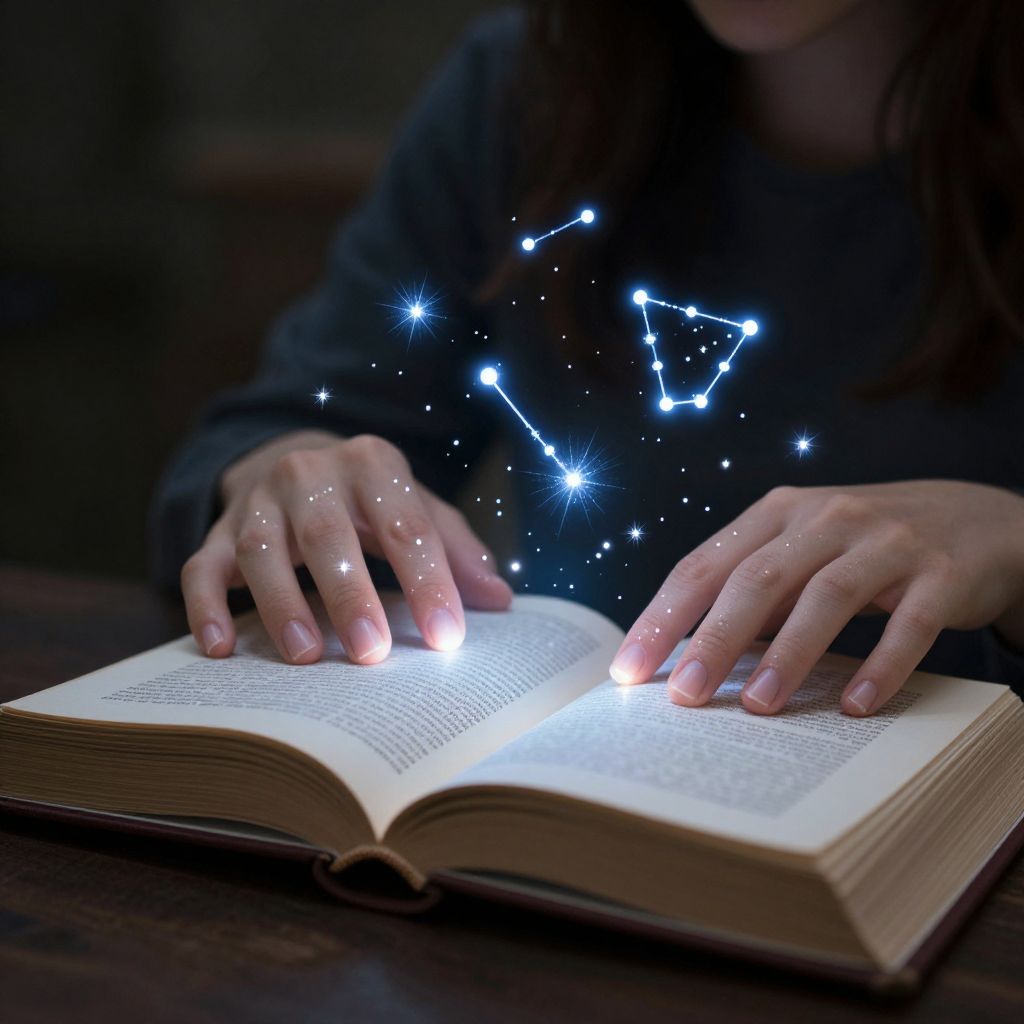Photograph of hands on an open book, illuminated by glowing white stars and constellation lines, set against a dark background.
