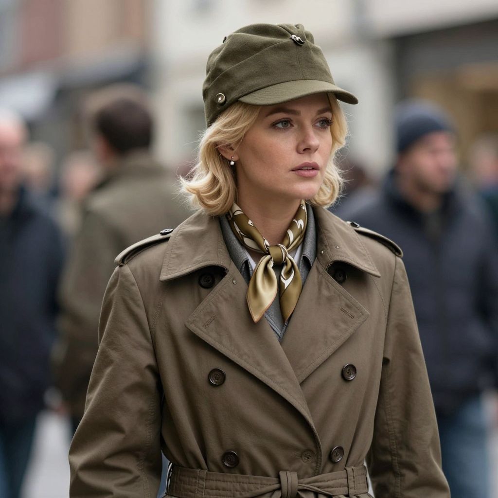 Blonde woman wearing a vintage military-style cap and a brown trench coat stands amidst a bustling street scene, her scarf tied neatly around her neck as she gazes thoughtfully to the side.