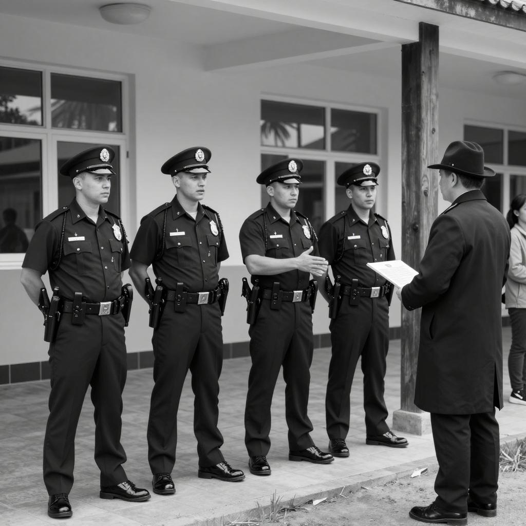 Black-and-white photograph of three men with motorcycles. Two men on motorcycles wear wide-brimmed hats, sunglasses, and patterned shirts. One man stands to the right in a police uniform, looking at the cyclists. Helmets are on the ground. Metal fence and industrial background. Cyclists gesture with hands. One cyclist points to the left.