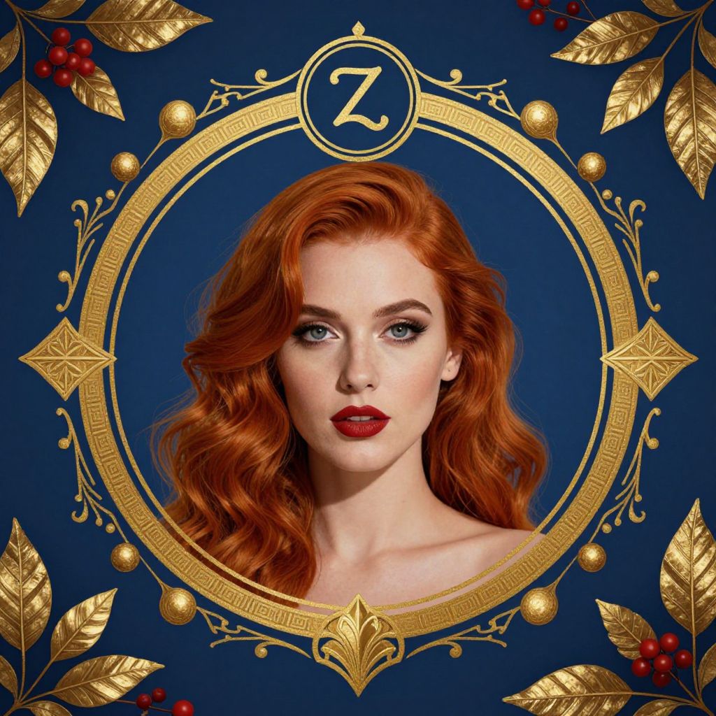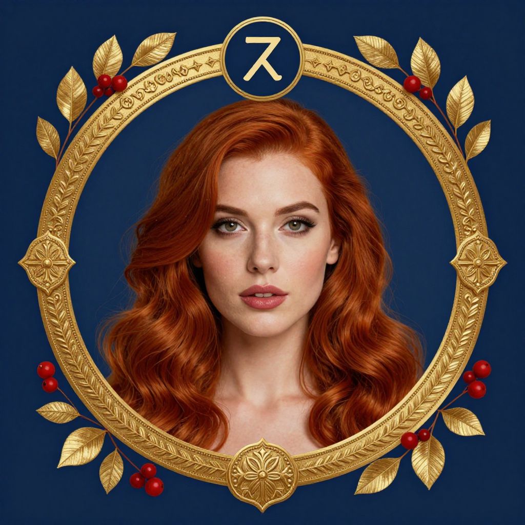 Elegant portrait of a woman with vibrant red hair framed by a golden circular border adorned with intricate designs, featuring a zodiac symbol above her head, surrounded by decorative elements including gold leaves and red berries against a deep blue background.