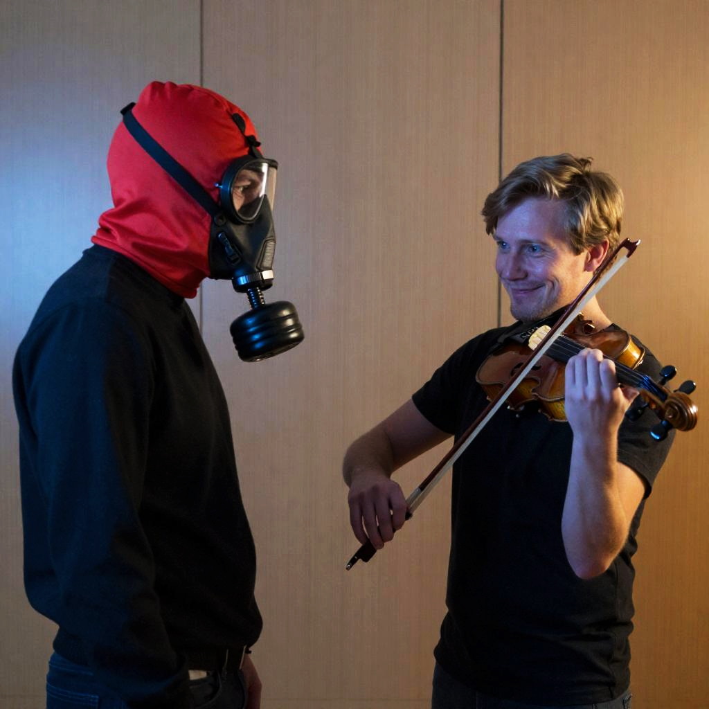 A photograph featuring two people indoors against a wooden panel background. On the left, a person wears a red hooded mask with a black gas filter, dressed in a black top. On the right, a blonde man wearing a black shirt plays the violin, smiling. The scene is illuminated with contrasting blue and yellow lighting.