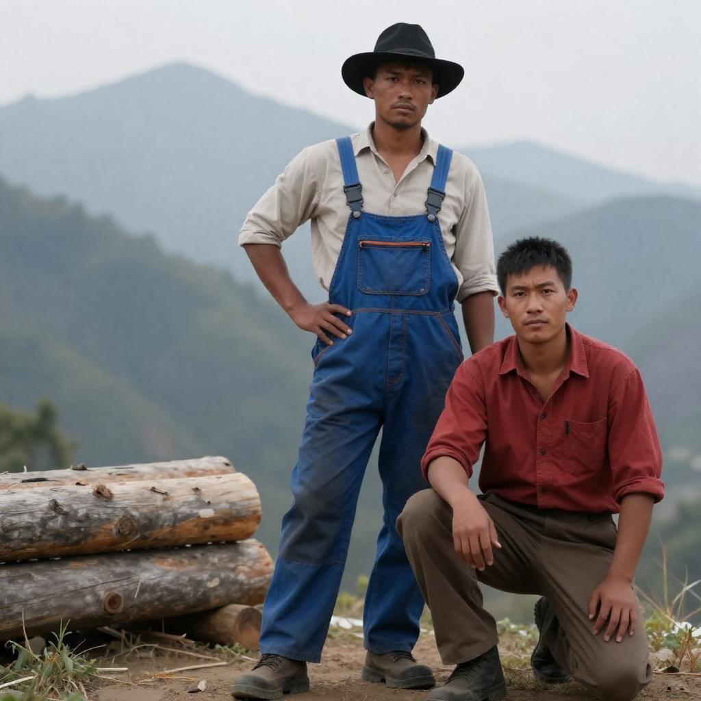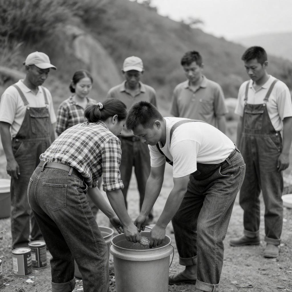 Black-and-white photograph of a group of men and women working together outdoors. Central man bends over to assist a woman filling a bucket. Women wear checkered shirts and belts; men wear denim overalls and hats. Rocky hillside background. Various expressions of concentration. Five men, five women. Cans and buckets scattered around.