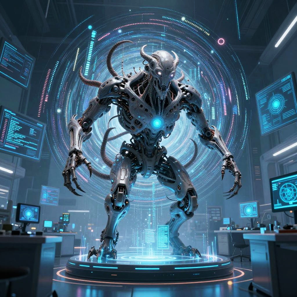 A monstrous AI creature emerging from a swirling vortex of data streams and virtual code, with organic and mechanical limbs intertwined, glowing eyes scanning the horizon, set in a high-tech laboratory filled with holographic screens and blinking consoles