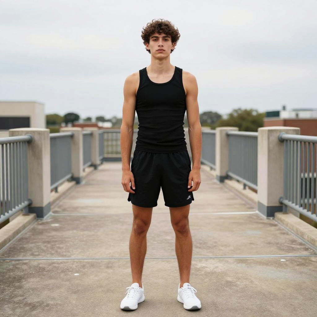 Photograph of a young, athletic man with curly brown hair, wearing a black tank top, black shorts, and white sneakers, standing on a concrete